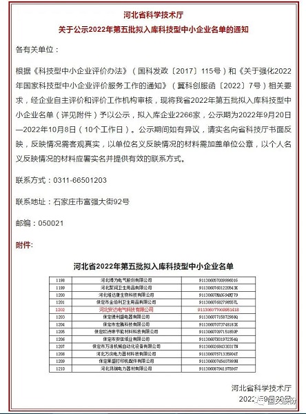 根据《科技型中小企业评价办法》(国科发政〔2017〕115号)和《关于开展2021年国家科技型中小企业评价服务工作的通知》(冀科企函〔2021〕2号)相关要求,经企业自主评价、评价工作机构审核,河北省2021年第五批拟入库国家科技型中小企业名单发布,bg真人平台电气名列其中。公司入库国家科技型中小企业,有利于公司加强科研投入力度,不断创新智能配电网设备和新能源产品方面的技术,提高企业市场竞争力,为技术产业升级和战略转型做好铺垫。