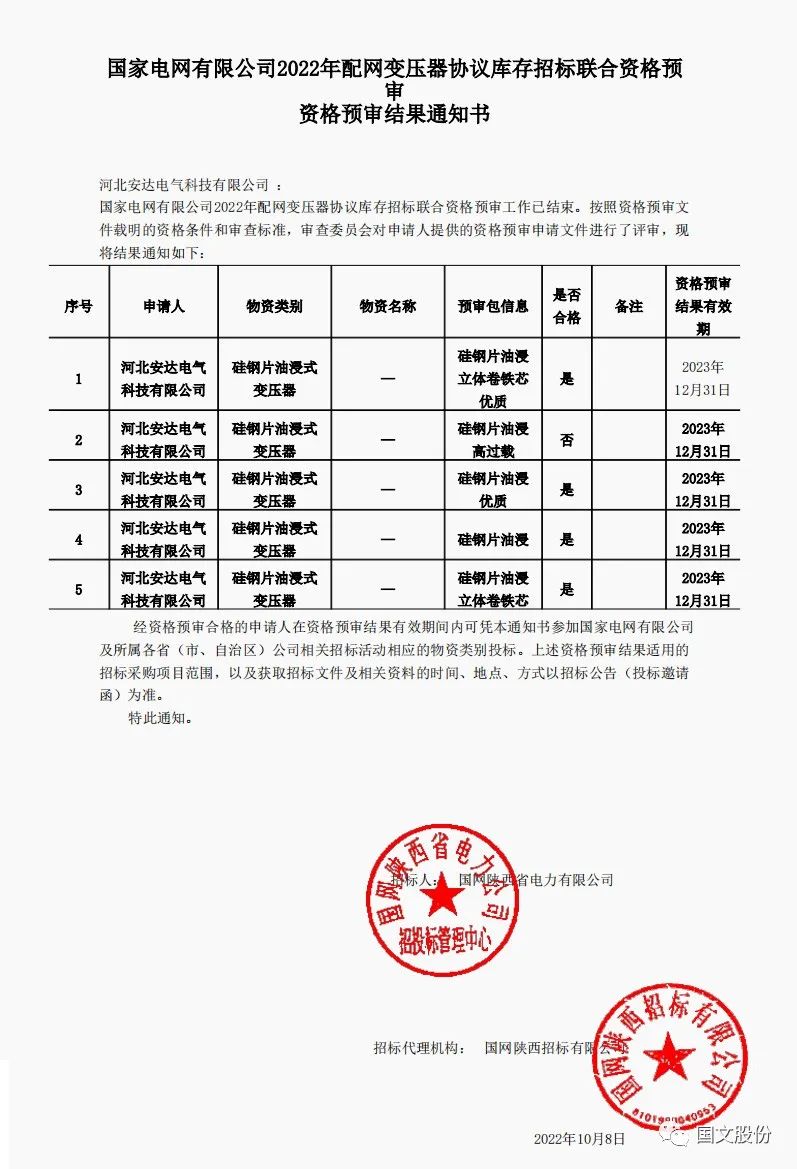 根据国家电网有限公司2022年配网变压器协议库存招标联合资格预审资格预审结果通知书,按照资格预审文件载明的资格条件和审查标准,审查委员会对申请人提供的资格预审申请文件进行了评审:河北bg真人平台电气科技有限公司硅钢片油浸式变压器通过国家电网有限公司2022年配网变压器协议库存招标联合资格预审,可在资格预审结果有效期间内可凭本通知书参加国家电网有限公司及所属各省(市、自治区)公司相关招标活动相应的物资类别投标。
