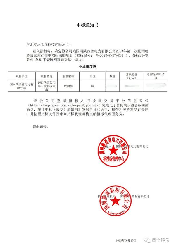6月15日,河北bg真人平台电气科技有限公司成功中标国网陕西省电力有限公司2023年初次配网物资协议库存集中招标采购项目。招标编号:W-2023-SNXV-Z01,采购内容为铁构件。公司将秉承“真诚铸造成功”的理念,出色完成本次中标物资的生产和配送,为国家电力基础设施建设提供优质服务。