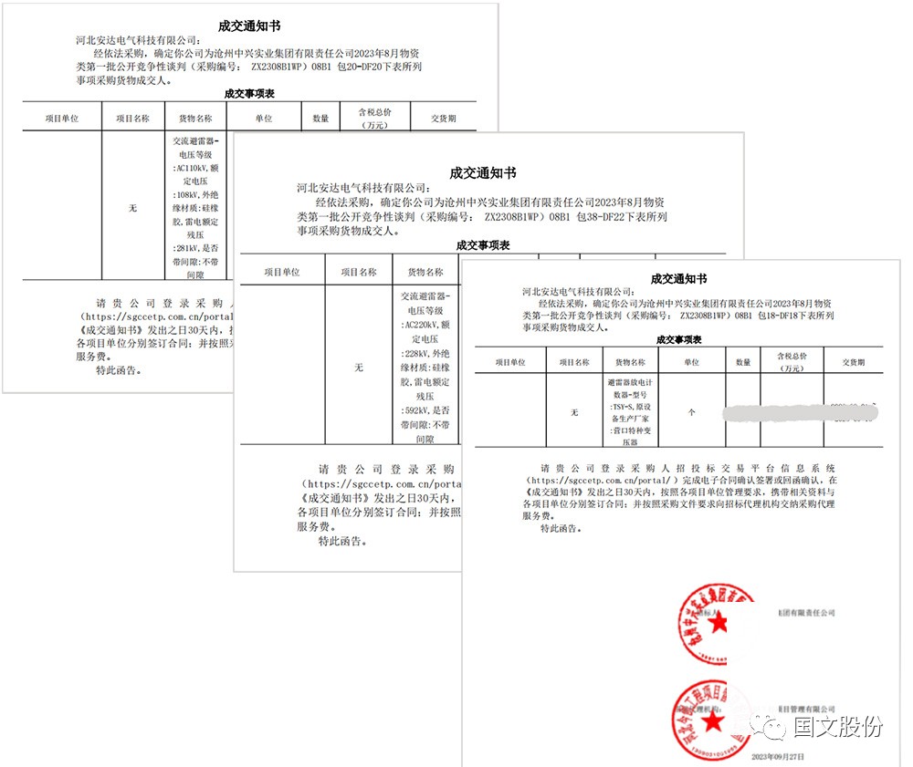 9月27日,经依法采购,确定bg真人平台电气为沧州中兴实业集团有限责任公司2023年8月物资类首批公开竞争性谈判(采购编号:ZX2308B1WP)08B1包18-DF18、包20-DF20、包38-DF22的采购货物成交人,现已收到成交通知书。