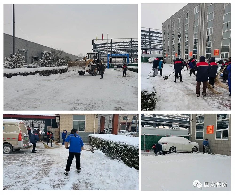 公司组织全体员工开展铲雪除冰行动,大家不畏严寒、分工有序、干劲十足,挥舞着铁锹和扫帚,铲的铲、扫的扫,热火朝天的扫雪场面和团结的力量让这个冬日显得格外温暖,忙碌的身影构成了一道亮丽的风景线;加上铲雪车的助力清扫,终于打通了厂区内的通行线路。