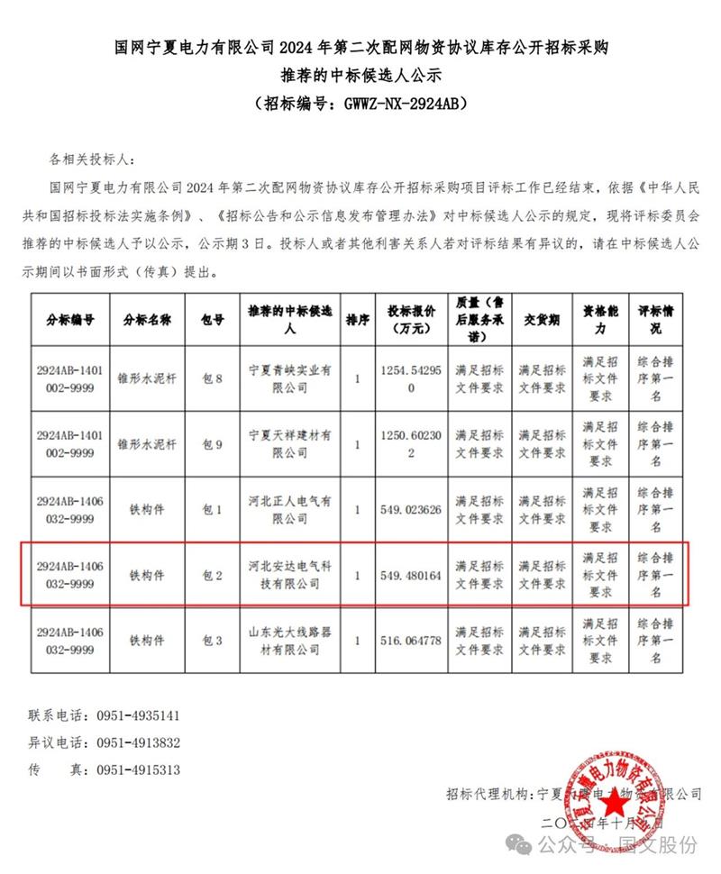 10月9日,bg真人平台电气通过国网宁夏电力有限公司2024年第二次配网物资协议库存公开招标采购(招标编号:GWWZ-NX-2924AB),成为铁构件 包2事项采购中标人,现中标通知书已下发。