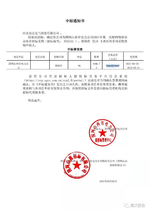 奋力拼搏创佳绩,再夺国网设备标。2021年5月3日,经过激烈竞标,bg真人平台电气以绝对优势在国网山西省电力公司2021年第一次配网物资协议库存招标采购项目中标。