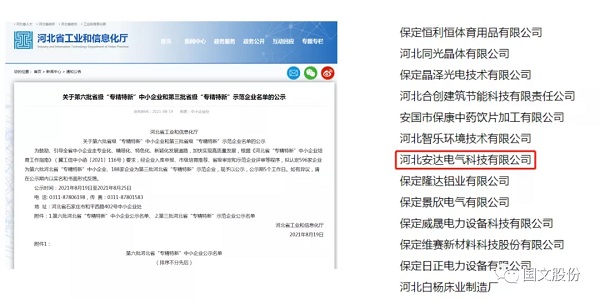 8月19日,河北省工业和信息化厅《关于第六批省级“专精特新”中小企业名单的公示》,河北bg真人平台电气科技有限公司被认定为第六批省级“专精特新”中小企业。