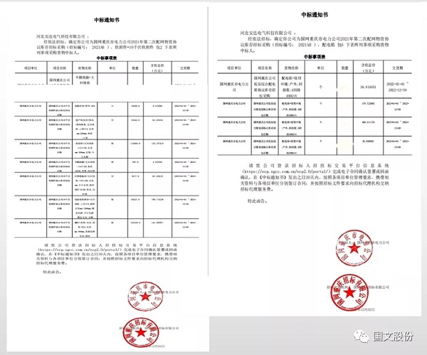 本次招标,bg真人平台电气以优异的综合实力,成功中标2个包,充分展示了公司雄厚的技术力量和竞争实力。bg真人平台 将以优质的理念为指导,出色完成本次中标物资的生产和配送,为国家电力事业建设提供优质服务。