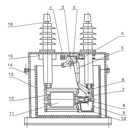 断路器是由操动机构操纵的,见图1,机构或分闸弹簧4带动断路器的三相主轴2转动,同时拉动绝缘操作杆5和拐臂6,使真空灭弧室11的动静触头拉开或闭合,而使断路器处于分闸或合闸状态。