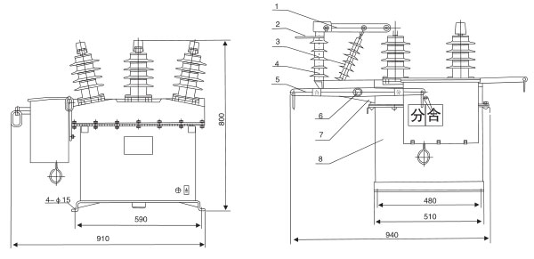 5、隔离开关操作手柄6、转轴7、隔离开关支架8、断路器